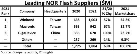 NOR Flash在近几年内极受市场的欢迎。据半导体市场研究机构IC Insights的数据,NOR Flash产品的销售额在2021年飙升63%至29亿美元,出货量增长了33%,平均售价则上涨23%。即便是2022年价格波动明显,但车用NOR Flash的市场表现依然亮眼。