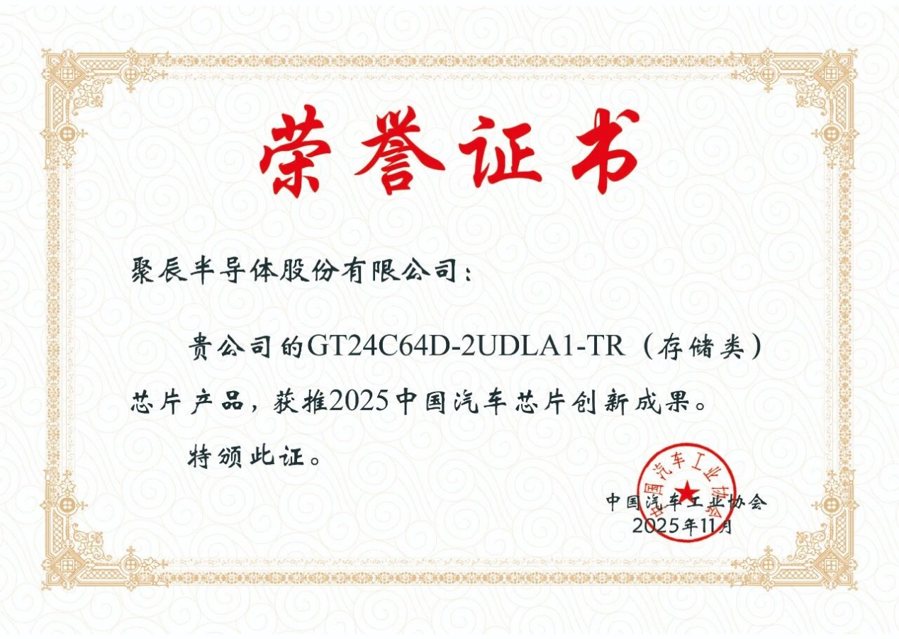 2025年11月24-26日,由中国汽车工业协会主办的“2025中国汽车供应链大会”在安徽芜湖隆重举行。现场揭晓了“2025中国汽车供应链创新成果”与“芯片创新成果”,j9九游会的GT24C64D-2UDLA1-TR车规级EEPROM芯片凭借优异的技术创新性和市场表现力,获评2025中国汽车芯片创新成果。